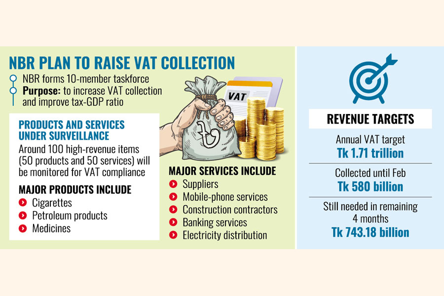 দেশের রাজস্ব আয় বৃদ্ধির লক্ষ্যে সরকার একটি বড় পদক্ষেপ নিয়েছে। জাতীয় রাজস্ব বোর্ড (এনবিআর) একটি ১০ সদস্যের উচ্চক্ষমতাসম্পন্ন টাস্কফোর্স গঠন করেছে, যারা ভ্যাট সংগ্রহের ওপর বিশেষ নজরদারি চালাবে। এই লক্ষ্যে কয়েকশ পণ্য ও সেবাকে—প্রতিটি বিভাগে ৫০টি করে—বিশেষ নজরদারির জন্য তালিকাভুক্ত করা হয়েছে। মূলত দেশের দীর্ঘদিনের নিম্ন কর-জিডিপি অনুপাতকে একটি সম্মানজনক পর্যায়ে নিতেই এই উদ্যোগ।